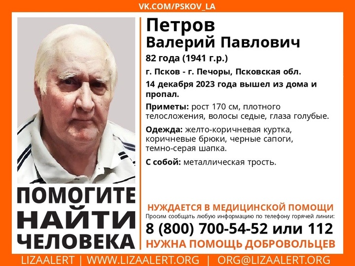 На территории Верхневолжья может находиться 82-летний Валерий Петров. Как сообщает поисковый отряд "ЛизаАлерт" Тверской области, 14 декабря мужчина покинул свой дом и пропал.