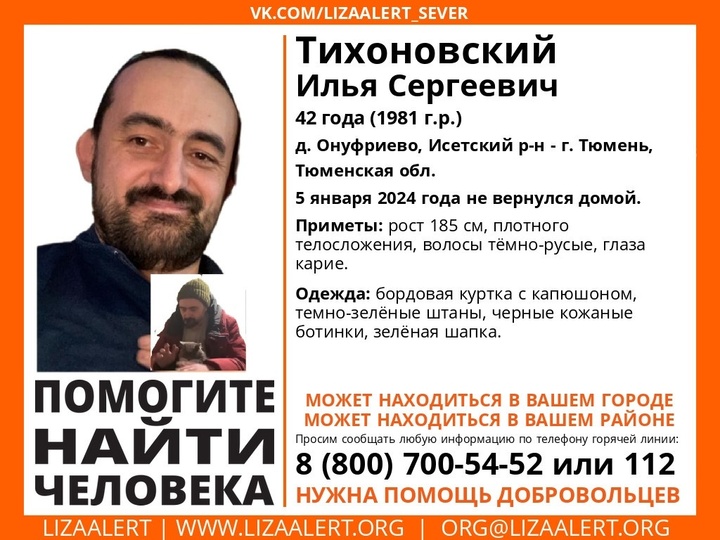 На территории Верхневолжья может находиться Илья Тихоновский, житель Тюменской области. Как сообщают в группе поискового отряда «ЛизаАлерт» Тверской области, 5 января мужчина ушел из деревни Онуфриево и не вернулся.