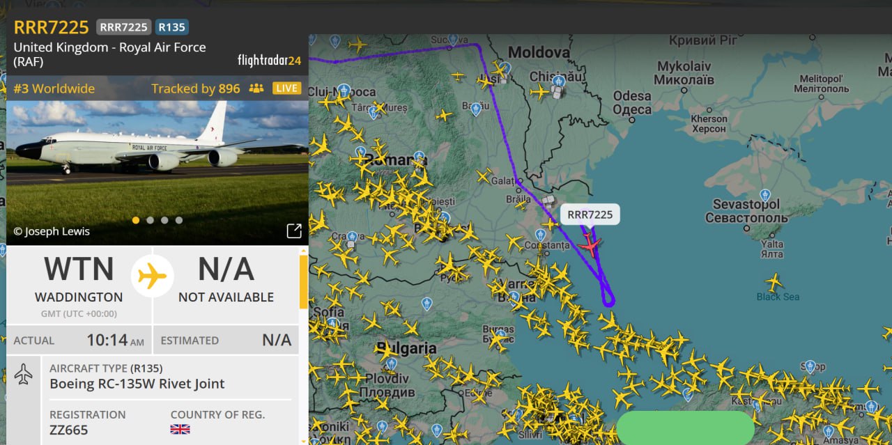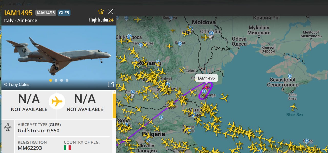 В районе западного побережья Черного моря, кроме хорошо знакомого нам британского разведчика Boeing RC-135W Rivet Joint, вероятно, работающего в сопровождении истребителей с отключенными транспондерами, также присутствует не самый частый гость на данном направлении — самолёт ДРЛОиУ Gulfstream G550 AEW ВВС Италии