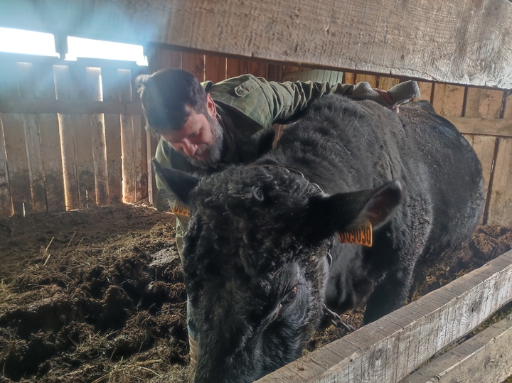 - Он любит, чтобы ему чесали шейку, - Александр заходит в загон к своему бычку. - Абердино-ангусская порода предполагает мощную шею, узкие плечи и крупные короткие ноги, значит, что костей мало, а мяса - много. При его 800 кг выход вкуснейшего мяса составит 500 кг, в то время как обычный красный степной бык даст максимум 400 кг. Боря отвечает за рождаемость. Работать на демографию он может до 15 лет. Но его придется продать, потому что потомство выросло, а осеменять с родственниками - это плохо: животные мельчают.