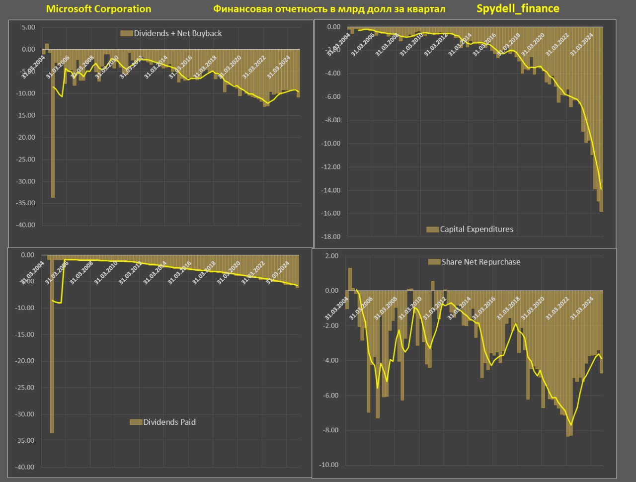 Microsoft значительно сокращает долю акционерной политики в структуре операционного денежного потока, перераспределяя все доступные ресурсы в капитальные расходы (доминирующая часть по ИИ), которые растут по экспоненте.