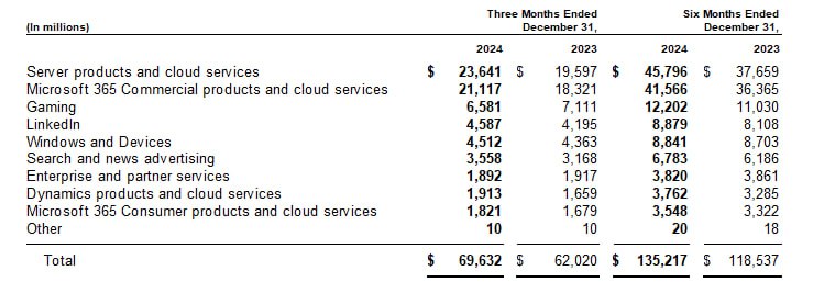 Второе по важности подразделение - Microsoft 365 Commercial products and cloud services, выручка в котором составила 21.1 млрд за 4кв24 с ростом на 15.2% г/г.