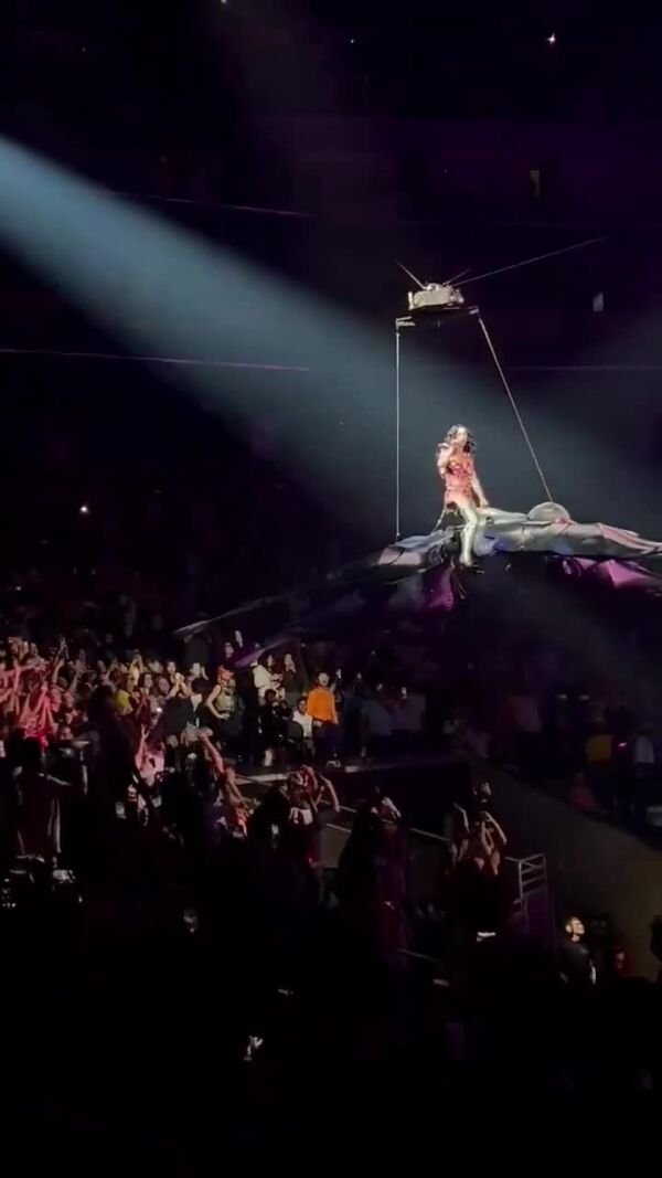 Последний выход Перри на сцену и вовсе чуть не закончился трагедией. Во время исполнения одной из песен артистка залезла на огромную металлическую бабочку, поднялась на ней в воздух и пролетела над толпой фанатов. Только вот в какой-то момент крепления не выдержали и конструкция дернулась вниз, чуть не упав на фанатов. Кэти осталась сидеть на бабочке, но судя по всему, не на шутку перепугалась.