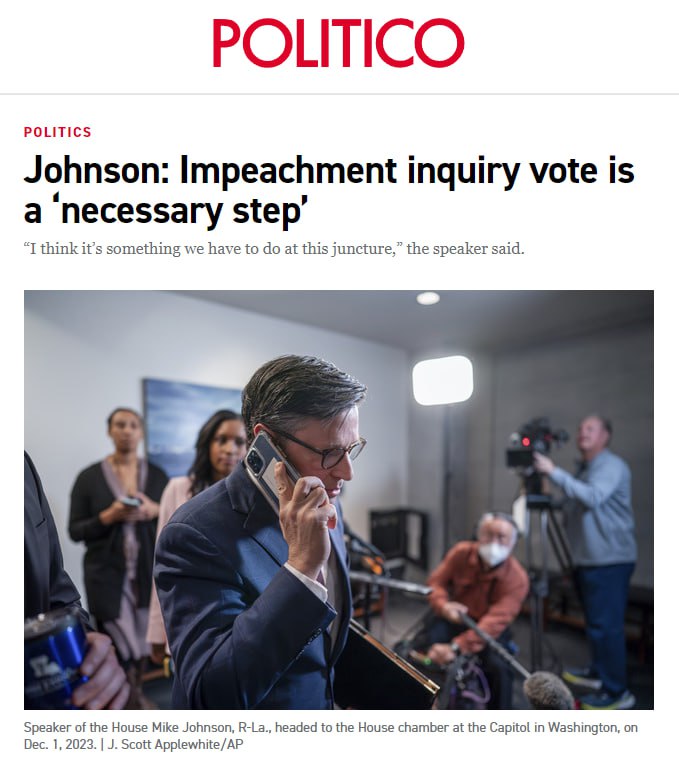 Спикер Палаты представителей Майк Джонсон в субботу дал понять, что планирует провести официальное голосование по расследованию импичмента президента Джо Байдена, назвав это «необходимым шагом».
