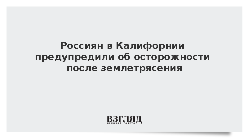 Посольство России в США призвало сограждан, которые находятся в Калифорнии, проявлять максимальную осторожность из-за землетрясения. Как передает РИА «Новости», в сообщении дипмиссии говорится: «Настоятельно рекомендуем российским гражданам, находящимся в США, а также планирующим в ближайшее время посетить штат Калифорния, проявлять максимальную осторожность и неукоснительно следовать рекомендациям местных властей».