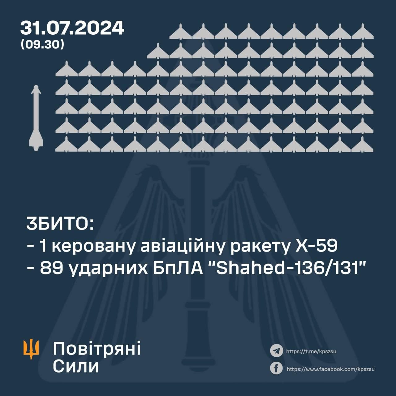 Воздушные силы Украины сообщают о том, что ночью были сбиты все 89 Гераней, запущенных по Украине.