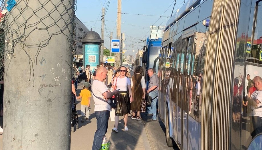 По его словам, движение парализовано из-за обрыва контактного провода, на месте работает аварийная бригада Горэлектротранса.