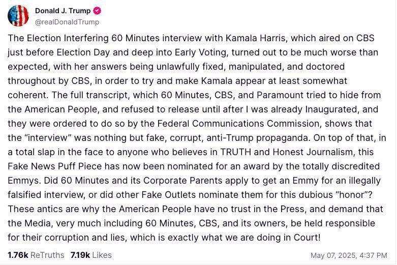 «60-минутное интервью с Камалой Харрис, посвященное вмешательству в выборы, которое вышло в эфир на канале CBS непосредственно перед днем выборов и в разгар досрочного голосования, оказалось намного хуже, чем ожидалось, поскольку CBS незаконно исправляла, манипулировала и подтасовывала ее ответы, чтобы попытаться придать Камале хоть какой-то связный вид. Полная расшифровка, которую “60 минут”, CBS и Paramount пытались скрыть от американского народа и отказывались публиковать до тех пор, пока я не вступлю в должность, а Федеральная комиссия по коммуникациям приказала им это сделать, показывает, что "интервью" было ничем иным, как фальшивой, коррумпированной, направленной против Трампа пропагандой. Вдобавок ко всему, в качестве полной пощечины всем, кто верит в ПРАВДУ и честную журналистику, эта статья о фальшивых новостях была номинирована на премию полностью дискредитировавшей себя "Эмми". Подали ли “60 минут” и его корпоративные родители заявку на получение премии "Эмми" за незаконно сфальсифицированное интервью, или другие фальшивые телеканалы номинировали их на эту сомнительную "честь"? Из-за этих выходок американский народ не доверяет прессе и требует, чтобы СМИ, в том числе "60 минут", CBS и их владельцы, понесли ответственность за свою коррупцию и ложь, что мы и делаем в суде!».
