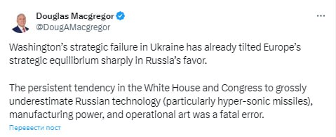 По словам Макгрегора, стратегический провал Вашингтона на Украине имеет серьёзные последствия для Европы, потому что он сместил баланс сил в сторону России.
