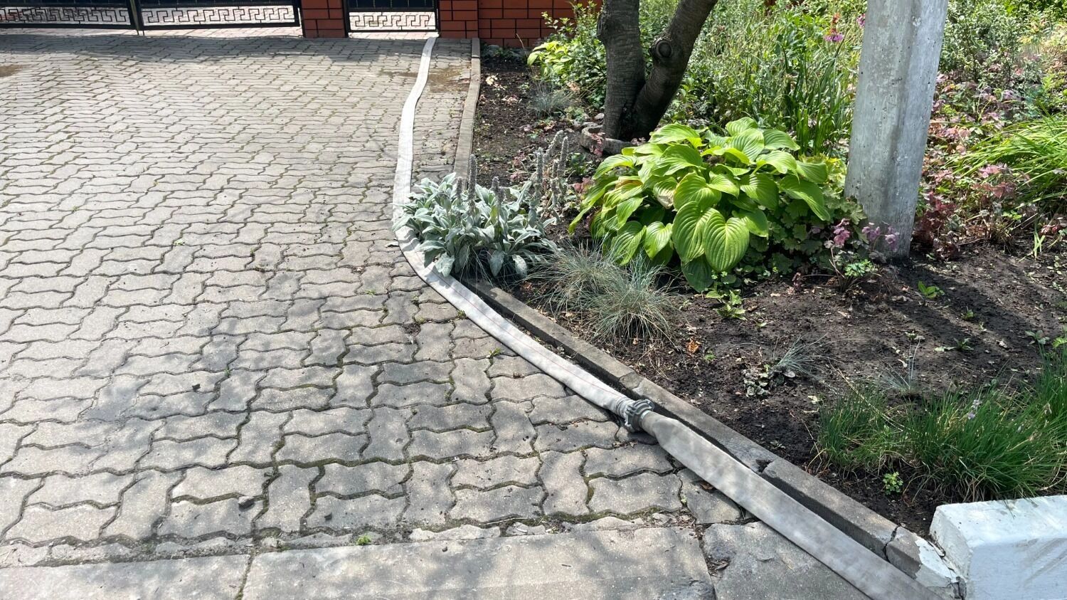 Но признаться честно, не это меня больше всего впечатлило. Тут недалеко есть парочка частных домов. Из-под забора одного из них торчит шланг, который выходит подальше от участка и сливается в тупике проезжей части. Скорее всего, это никому не мешает — там ведь тупик и никто не ездит, но мало ли какую воду туда сливают. Может быть, именно это и причина вечно забитых ливнёвок на Победы, ведь они очень недалеко друг от друга.