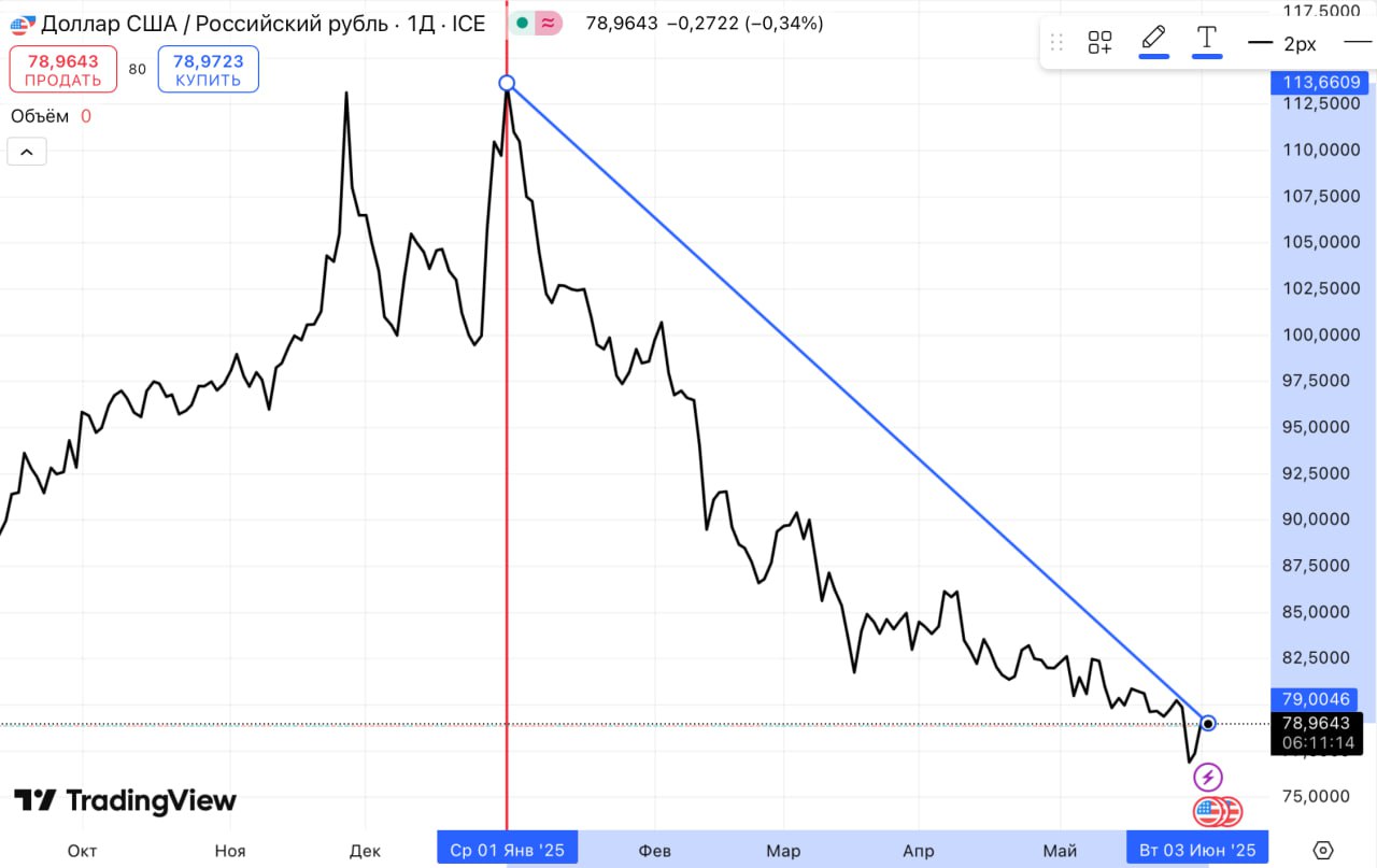 На картинке выше вы видите, как укрепился рубль за последние полгода - с 113 рублей за доллар до 79.