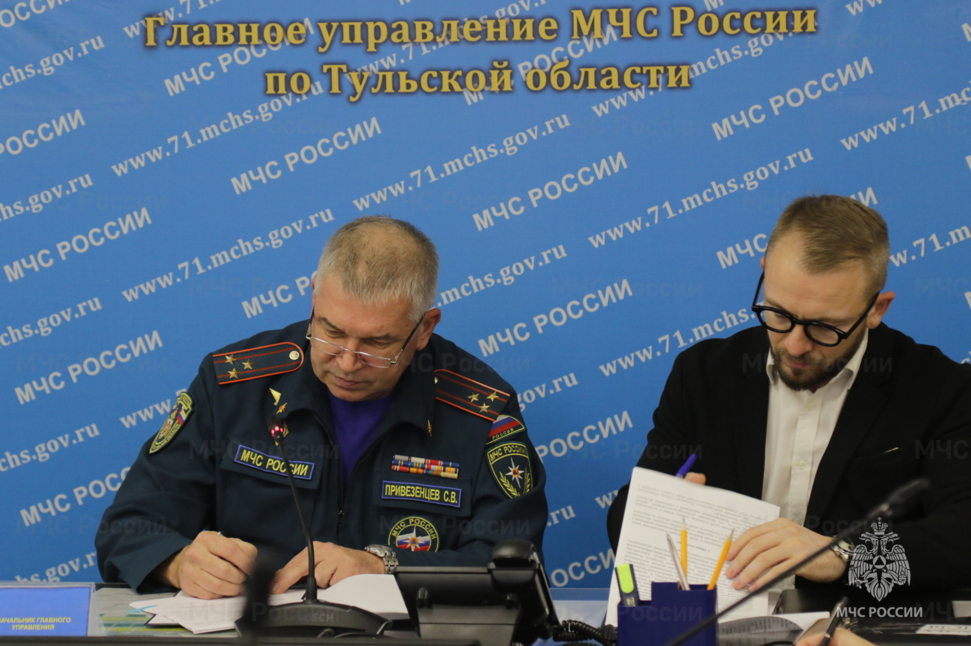 Заместитель начальника Главного управления МЧС России по Тульской области, ответственный за Государственную противопожарную службу, Сергей Привезенцев, и временно исполняющий обязанности директора центра, Вячеслав Родионов, подписали документ о взаимодействии.