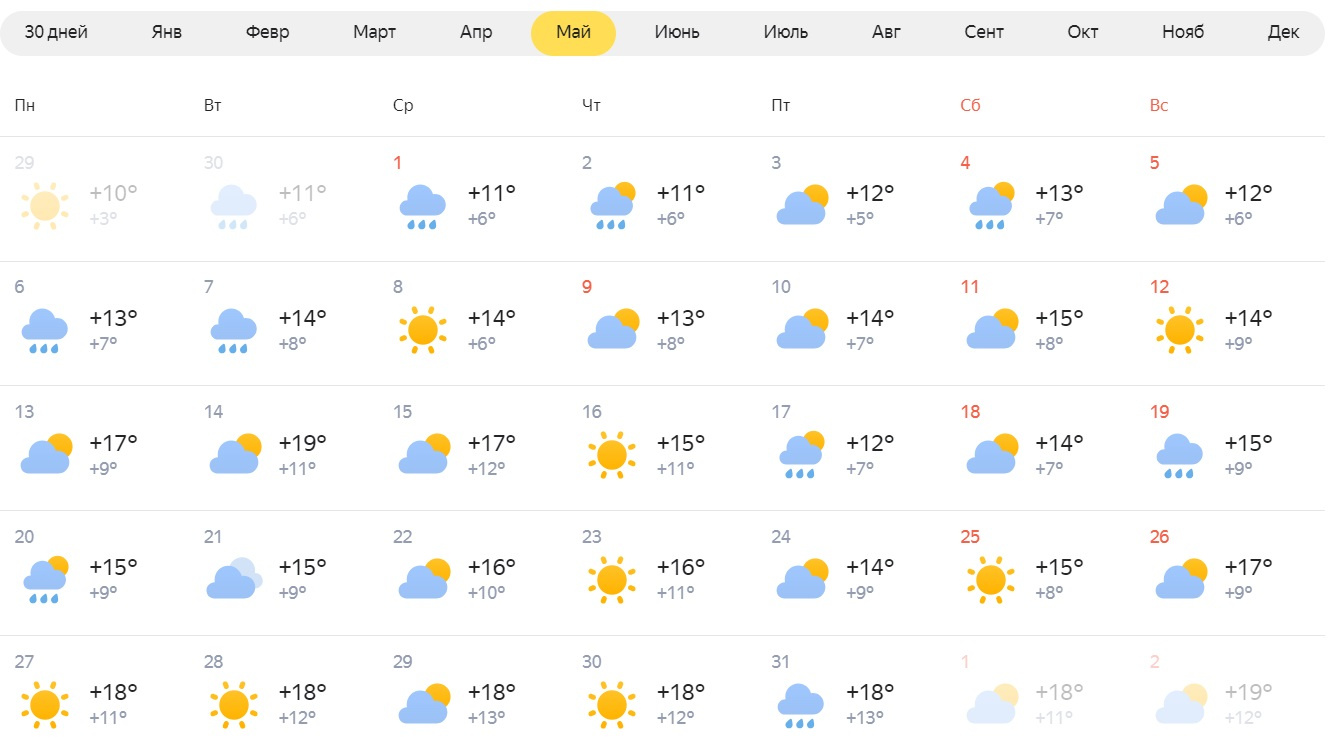 По прогнозу «Яндекс Погоды», самыми теплыми днями будут 27–30 мая. Дневные температуры достигнут +18 градусов, а ночные +11…+13 градусов.
