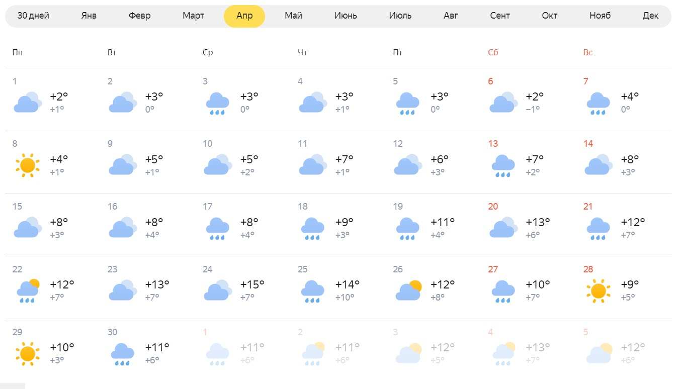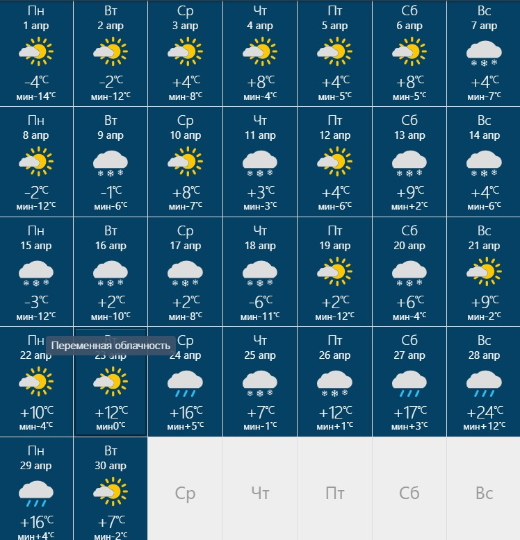 На 3, 5, 7, 17–19, 21–22, 25, 27 и 30 апреля обещаются дожди.