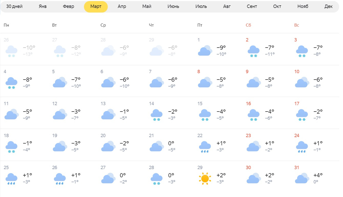 Прогноз «Яндекс Погоды» более спокойный. Согласно ему, снег может идти 2–4, 14–18 и 28 марта; дождь — 22, 24–26 марта.