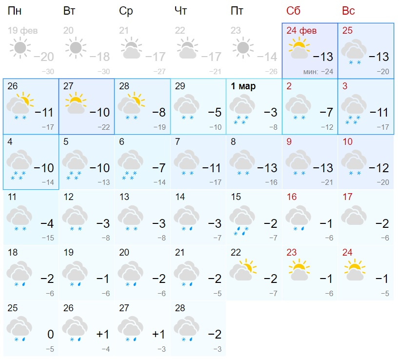 По прогнозу «Гисметео», в первый день весны в Новосибирске установится температура в -3…-8 градусов. К 8 марта ожидается похолодание до -13…-21 градусов. По информации сервиса, 16 дней подряд, с 1 по 16 марта? будет идти снег. Причем с 14-го — вместе с дождем. Затем до конца месяца осадки должны периодически прекращаться и возобновляться.