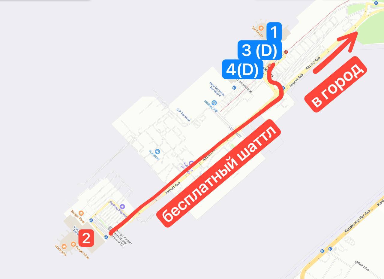 ➖ Между Т2 и 1, 3, 4 терминалами каждые 20 минут курсирует бесплатный шаттл, иногда он отправляется по мере заполнения. Также можно проехать на городских автобусах 400, 600 и 800