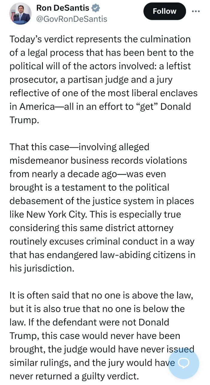 Ещё один экс-кандидат в президенты и губернатор Флориды Рон ДеСантис уверяет, что если бы ответчиком не был Дональд Трамп, то это дело никогда бы не было возбуждено.