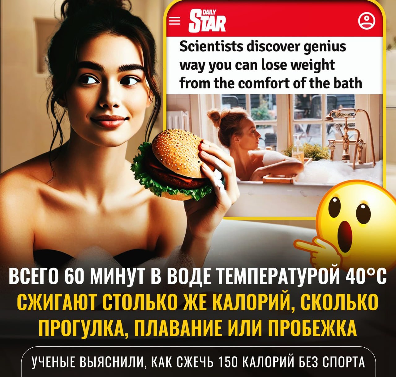 🔥 Час теплой ванной = 30 МИНУТ ХОДЬБЫ! Ученые из Университета Лафборо установили, что 15-минутный горячий душ сжигает около 320 калорий