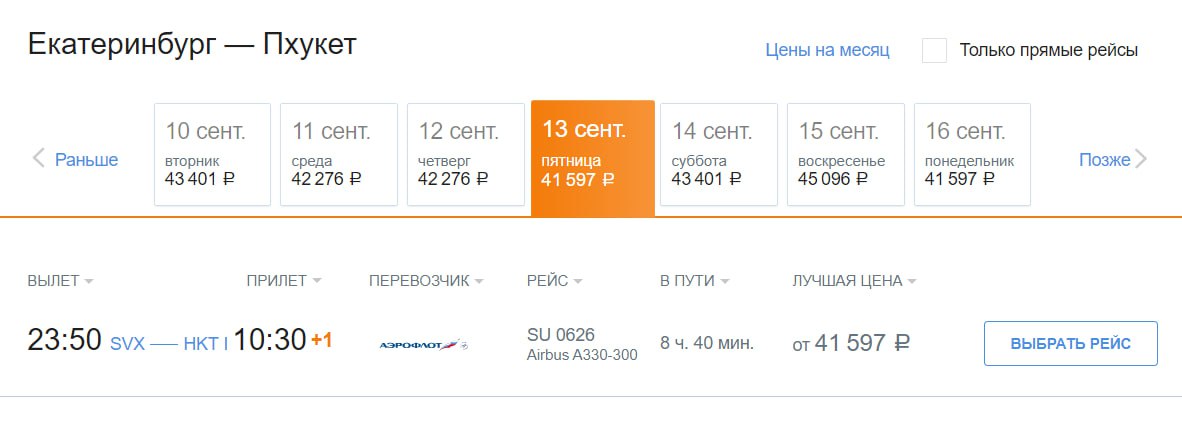 ➖На Пхукет: с 13 сентября по понедельникам и пятницам, с 3 октября вместо пятницы — по четвергам. Билеты — от 41 597 ₽ в одну сторону.
