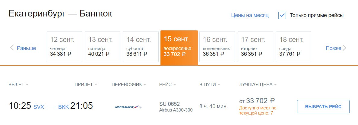 ➖В Бангкок: с 15 сентября по средам (кроме 18 сентября) и воскресеньям, с 30 сентября — по понедельникам и пятницам. Билеты — от 33 702 ₽ в одну сторону.