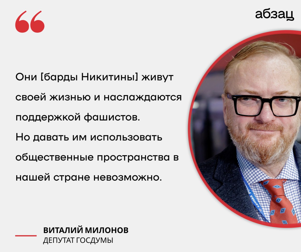 Депутат Госдумы Виталий Милонов в разговоре с «Абзацем» обещал посодействовать отмене выступления бардов Никитиных в рюмочной Санкт-Петербурга.