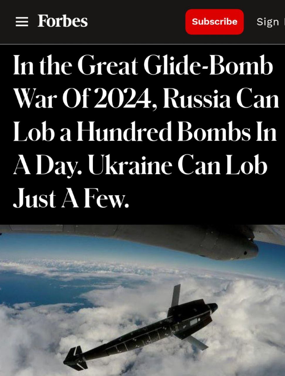 «В великой войне планирующих авиабомб Россия может сбросить сотню бомб за день. Украина — лишь несколько»: Forbes очень расстроен, что Киев не способен превзойти Москву по числу планирующих авиабомб и никакая поддержка Запада этого не изменит.