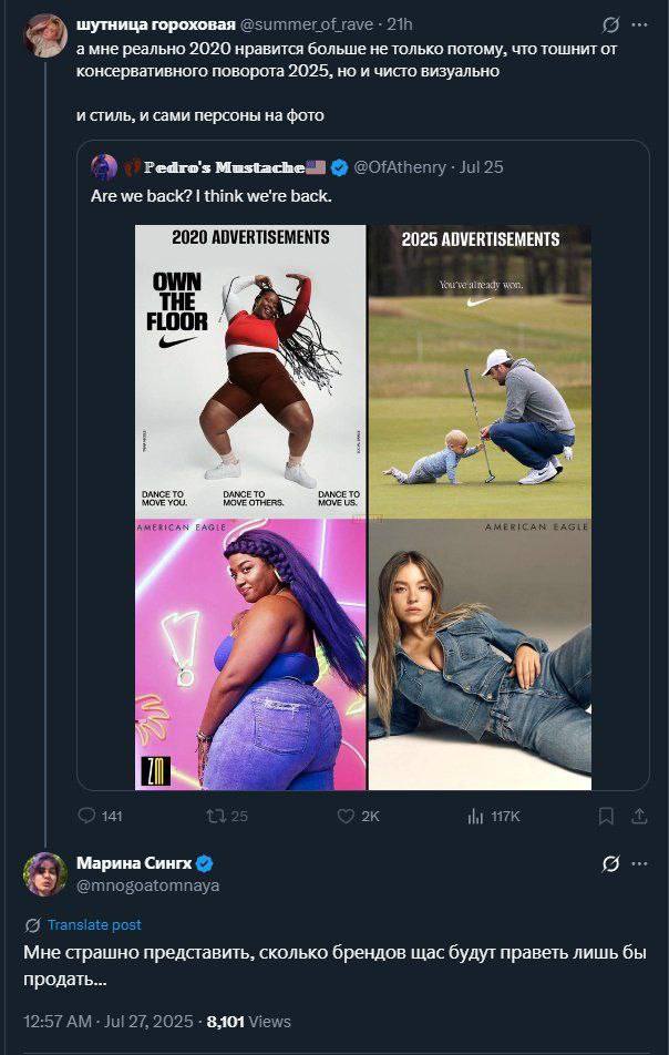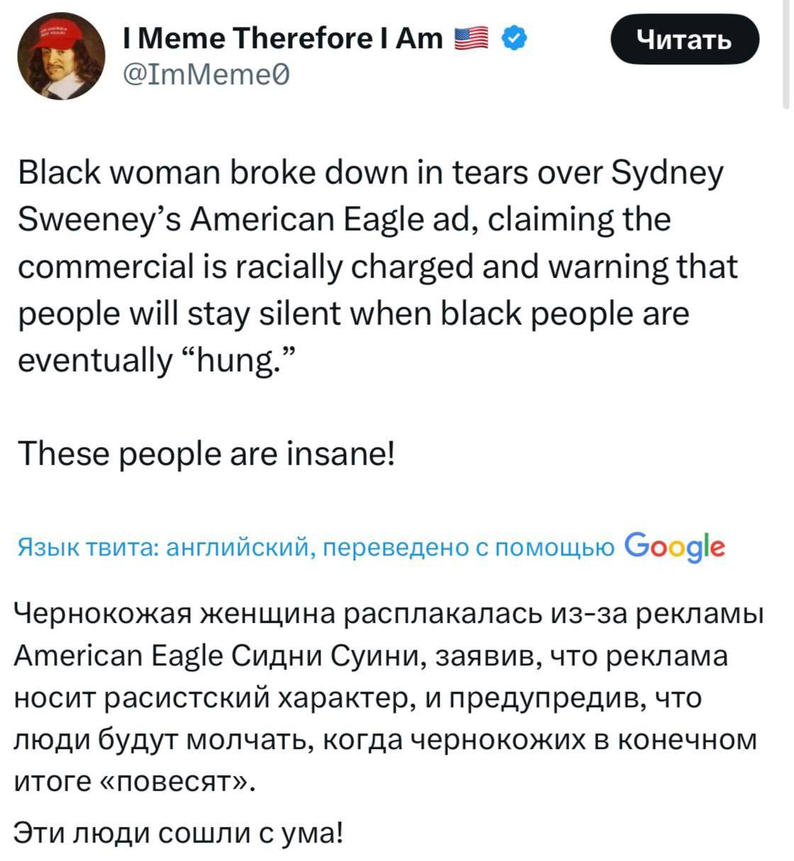 Бренд American Eagle вышел с рекламой, где их джинсы носит красивая спортивная белая девушка Сидни Суини. Компания отказалась от прежних фем-кампаний с толстухами и блмщицами.