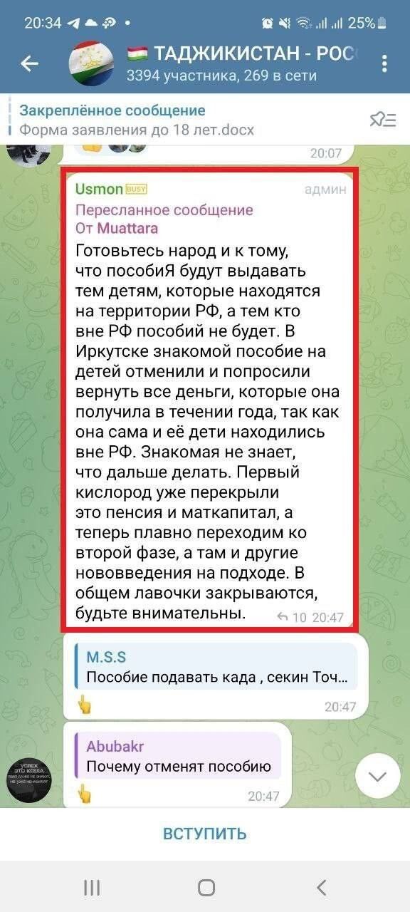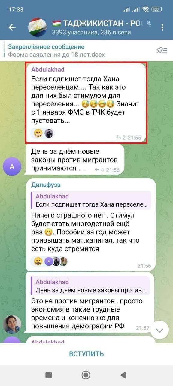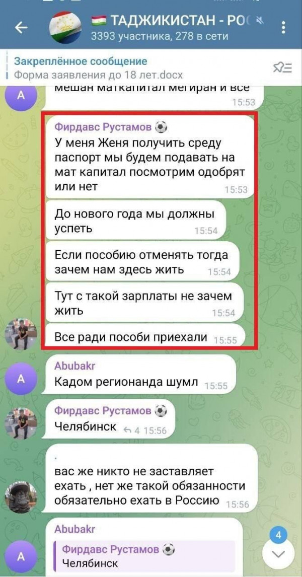 Кабанов, опубликовавший в своём Телеграм-канале скрины этих чатов, рассуждает:"Любопытна, хотя и понятна реакция в "мигрантских" чатах на новость о том, что маткапитал может стать недоступен для определенной части приехавших к нам за социальными плюшками выходцев из Средней Азии и Закавказья, что глубины души разочаровало и даже оскорбило эту категорию. После нанесенной им обиды наша страна вдруг потеряет для них значительную часть своей привлекательности (в случае, если эту норму примут). Тем более ими уже давно были разработаны/освоены и функционируют криминальные схемы "обналички" этих средств, в том числе переписывания долей на детей с целью дальнейшей благополучной жизни на своей реальной исторической родине.