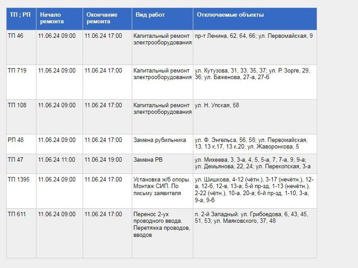 Мы публикуем полный список отключений электричества в Туле на одиннадцатое июня. Он опубликован на Интернет-ресурсе акционерного общества "Тульские городские электрические сети".
