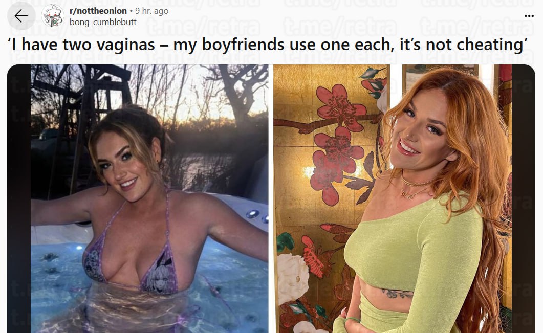 Женщина с двумя влагалищами рассказала, что у неё два парня, и при этом она не изменяет, потому они «пользуются» разными вагинами