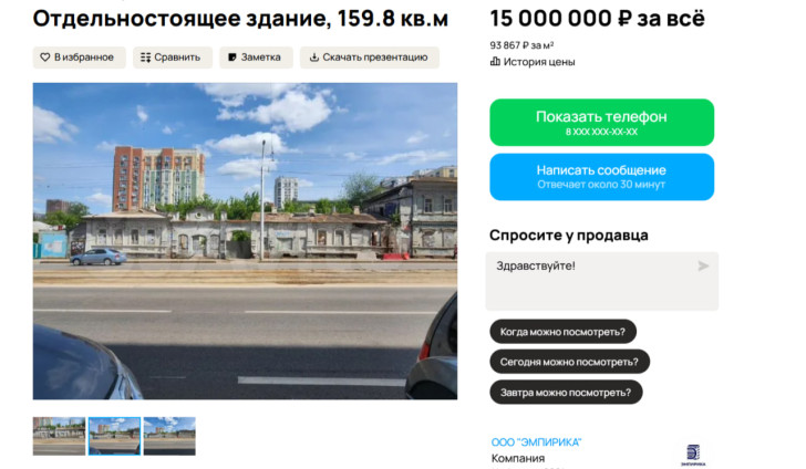 В объявлении также отмечается, что одноэтажное кирпичное здание было построено в начале XX века и ранее использовалось как жилой дом. Общая площадь усадьбы составляет 159,8 квадратного метра, площадь земельного участка – 5,46 сотки. У здания есть отдельный вход и прилегающая территория, которую можно использовать под парковку.
