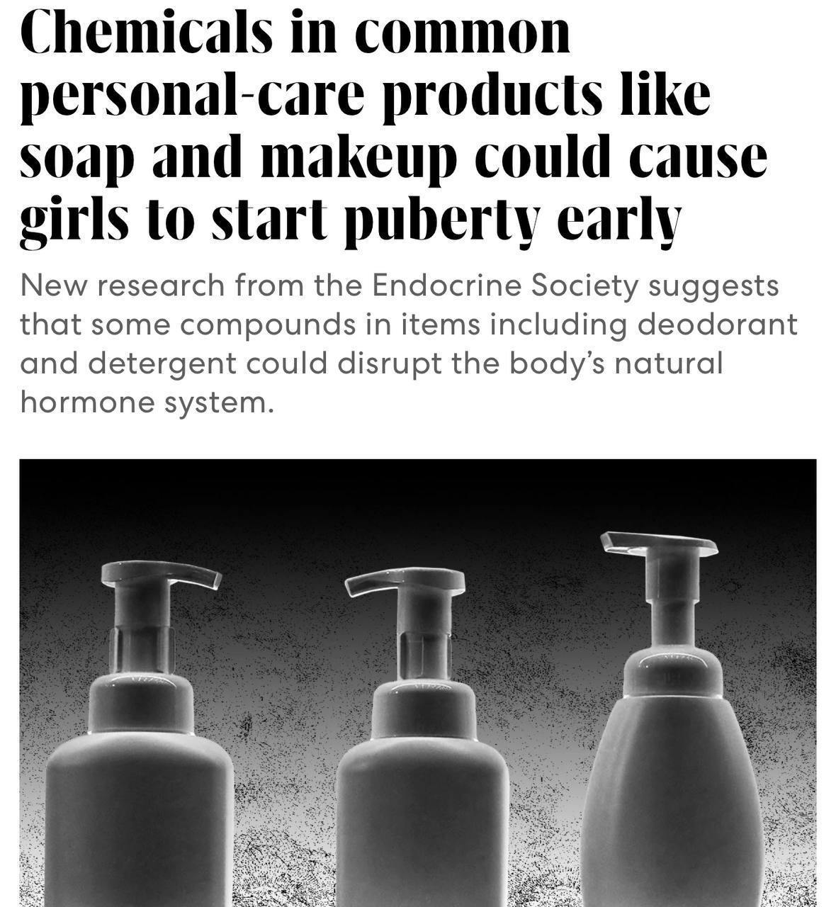 Всё из-за мускусной амбретты, которая используется в косметике, шампунях и парфюмерии. Компонент влияет на мозг и воздействует на отделы, которые провоцируют раннее созревание.