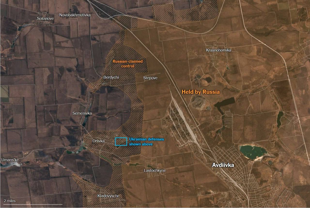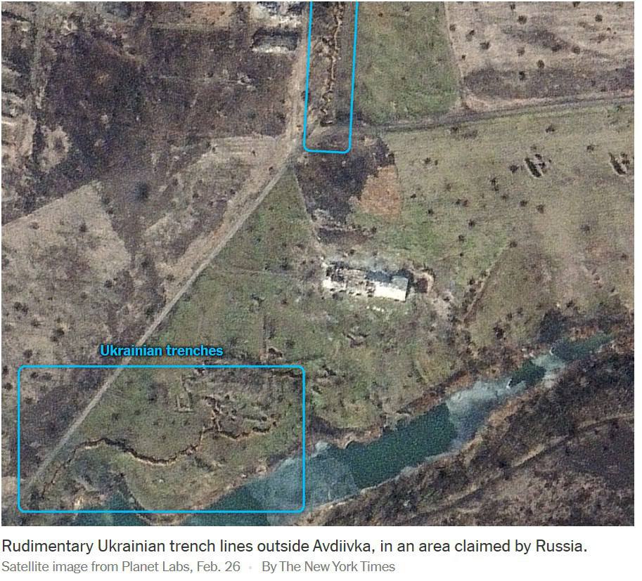 Успех российской армии, которая продолжает стремительное наступление после взятия Авдеевки, объясняется в том числе неподготовленными и слабоукрепленными позициями вооруженных сил Украины (ВСУ), пишет The New York Times (NYT), чьи журналисты проанализировали спутниковые снимки к западу от Авдеевки.