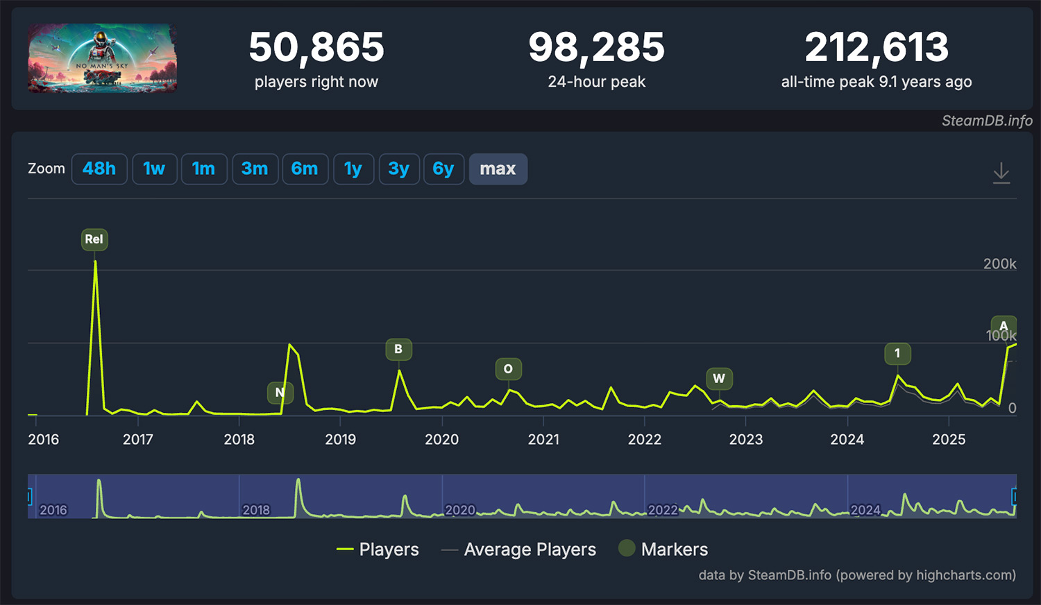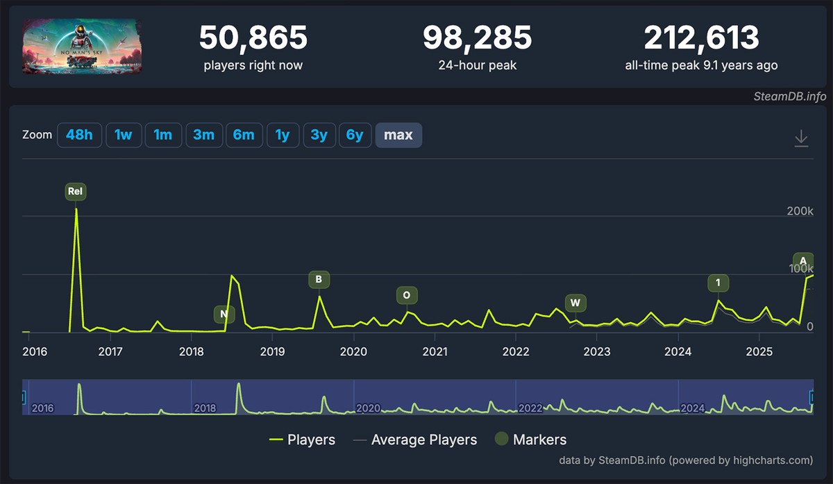No Man's Sky достигла пика одновременных игроков в Steam на уровне 98 285 человек – максимального показателя с момента запуска девять лет назад. Невероятный успех связан с выходом бесплатного обновления Voyagers, которое позволяет игрокам создавать собственные космические корабли.