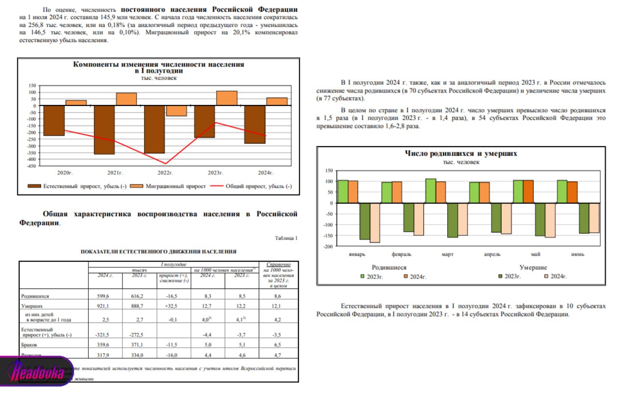 По итогам первого полугодия 2024 рождаемость в России упала до исторического минимума По данным Росстата, по итогам первого полугодия 2024 в России появилось на свет 599,6 тыс детей — на 16,6 тыс меньше, чем в тот же период 2023. Так, количество рождений детей снизилось еще на 3% в сравнении с прошлым годом. Тогда был самый низкий показатель в истории современной России с 1999. В июне этого года число новорожденных упало на 6% до 98,6 тыс. Это рекордно низкий показатель, ведь их количество никогда не опускалось ниже 100 тыс. Согласно данным Росстата, миграционный прирост на 20,1% компенсировал убыль населения. Среднее число детей на одну женщину репродуктивного возраста упало до 1,44. К сожалению, такой показатель тоже антирекорд — это самое низкое значение с 2008 года. За первое полугодие 2024 также выросла естественная убыль населения — она составила 321,5 тыс человек, а в 2023 за аналогичный период — 272,5 тыс человек.