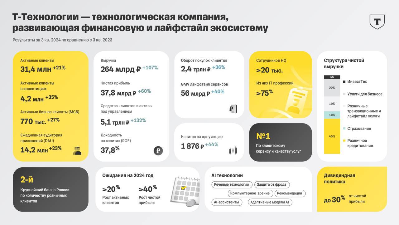 Выручка приросла на 107%, по отношению к третьему кварталу 2023, и составила 264 млрд рублей. Чистая прибыль выросла на 60%, составив 37,8 млрд, из которых 7,5 млрд рублей - прибыль Росбанка. По итогам всего 2024 года компания ожидает роста чистой прибыли на более чем 40% с учетом Росбанка.