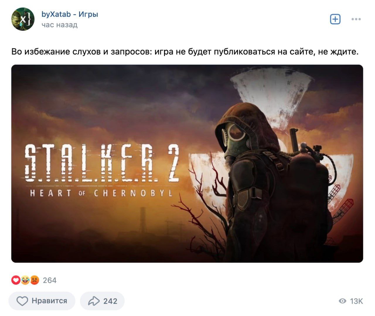 ⚡S.T.A.L.K.E.R. 2 бояться публиковать даже пираты: отечественный сайт byXatab не будет выкладывать репаки из-за риска штрафа или уголовного наказания.