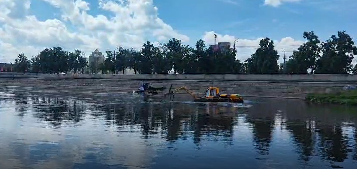 К очистке водной глади реки приступили несколько единиц техники. Работы начались на участке от моста на улице Красной до моста на проспекте Победы. С помощью навесов в виде косилок и грабель-коллекторов техника собирает растительность со дна реки и различный мусор. После сбора отходы выгружают на берег и увозят на утилизацию.