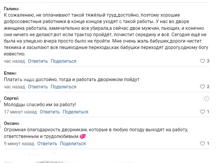 Пользователи соцсети оставили большое количество комментариев под постом, которые содержали как слова благодарности дворникам за их нелегкий труд, так и подсказки главе города, что самой лучшей благодарности со времен появления денег может стать повышение зарплаты. Тогда, по словам комментаторов, добросовестные работники не будут увольняться.