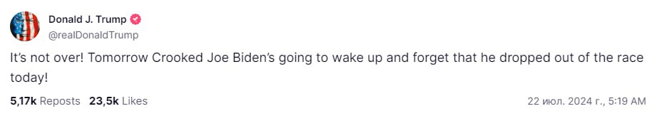 «Это ещё не конец! Завтра кривой Джо Байден проснётся и забудет, что сегодня он выбыл из гонки!» – написал он в соцсети Truth.