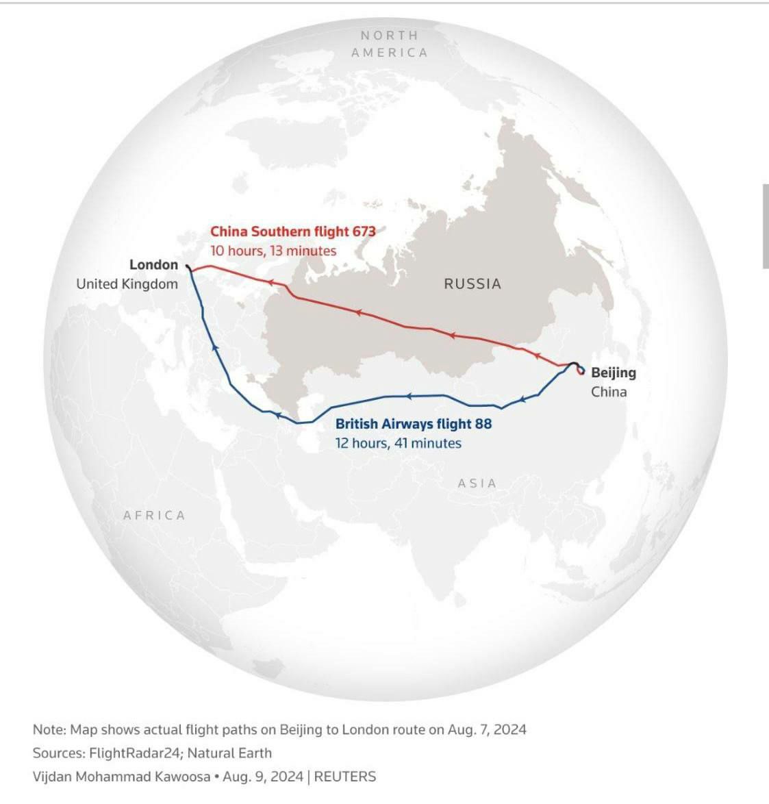 После начала СВО китайские авиаперевозчики продолжили использовать более короткие северные маршруты в Европу и Северную Америку через обширное воздушное пространство России.