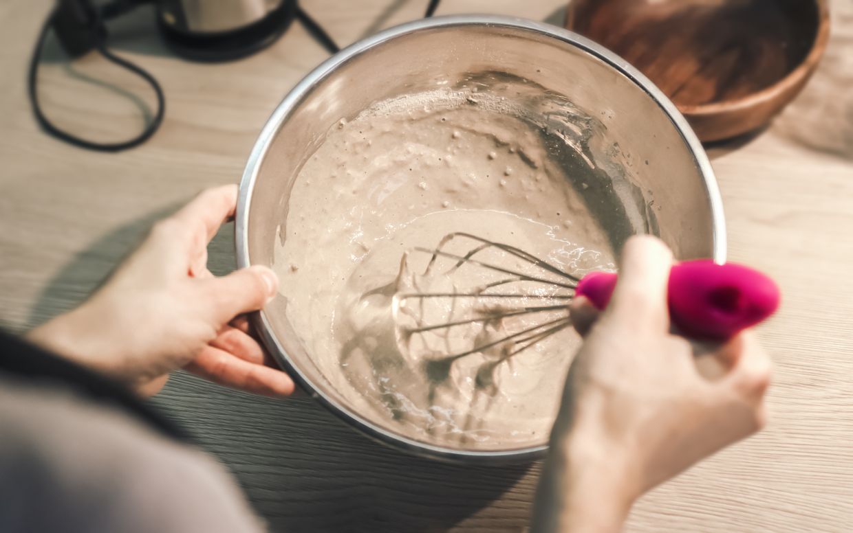 8. Венчиком вмешайте в массу оливковое масло, чтобы получилась эмульсия.