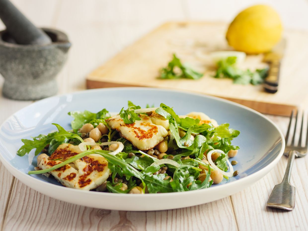 4. Разогрейте сковороду-гриль и прижарьте сыр до золотистой корочки. Если кусочки «Халуми» не становятся мягкими в центре, подпеките его в духовке при 180°С 10–15 минут.