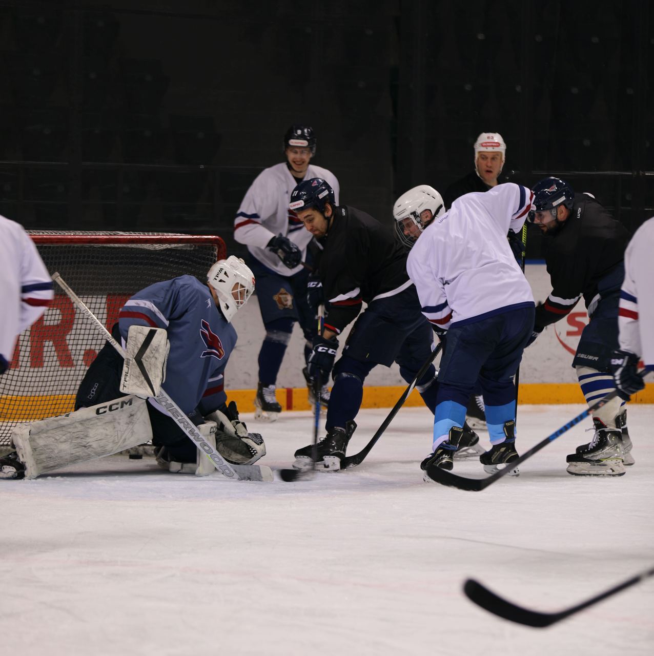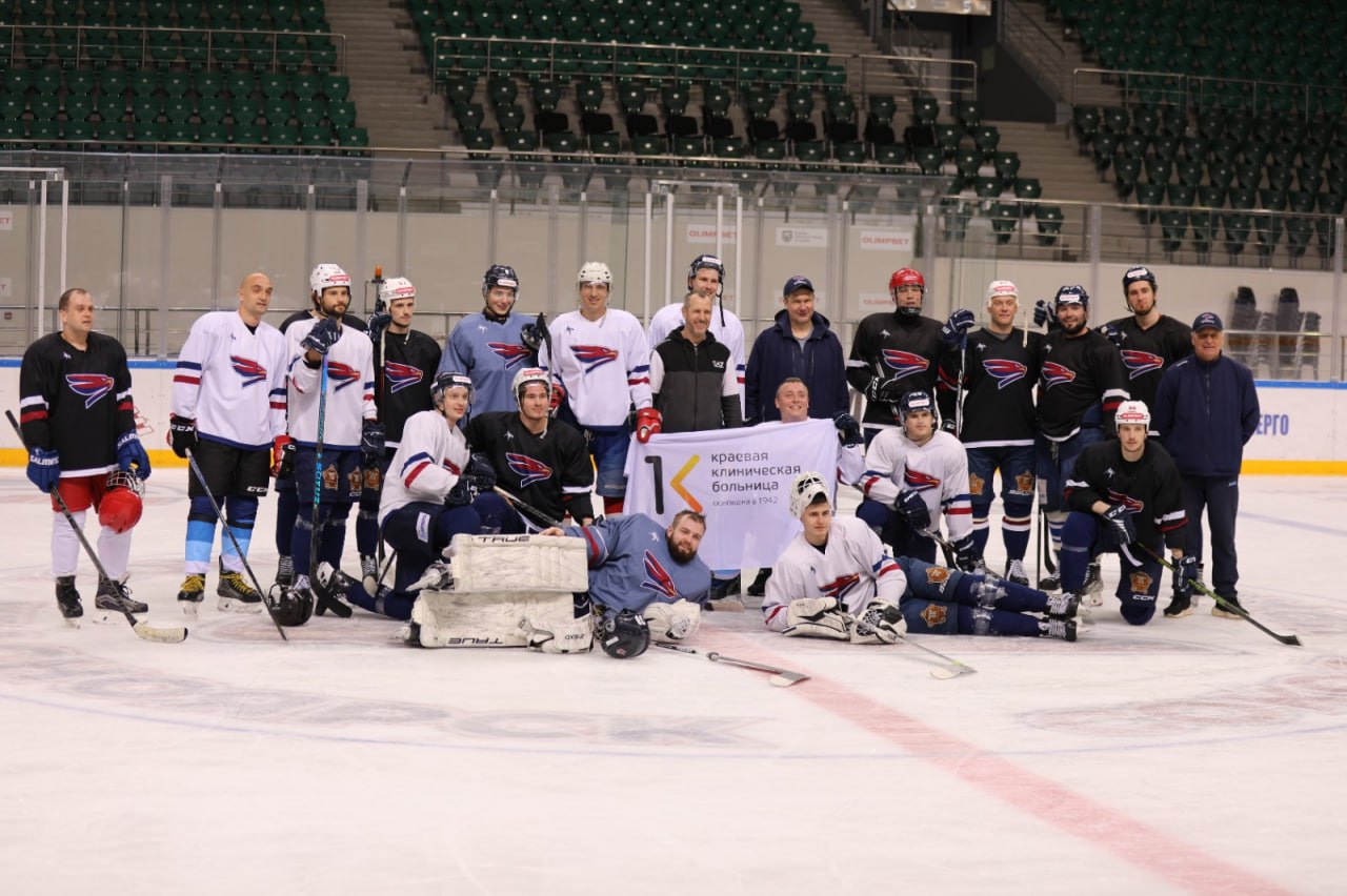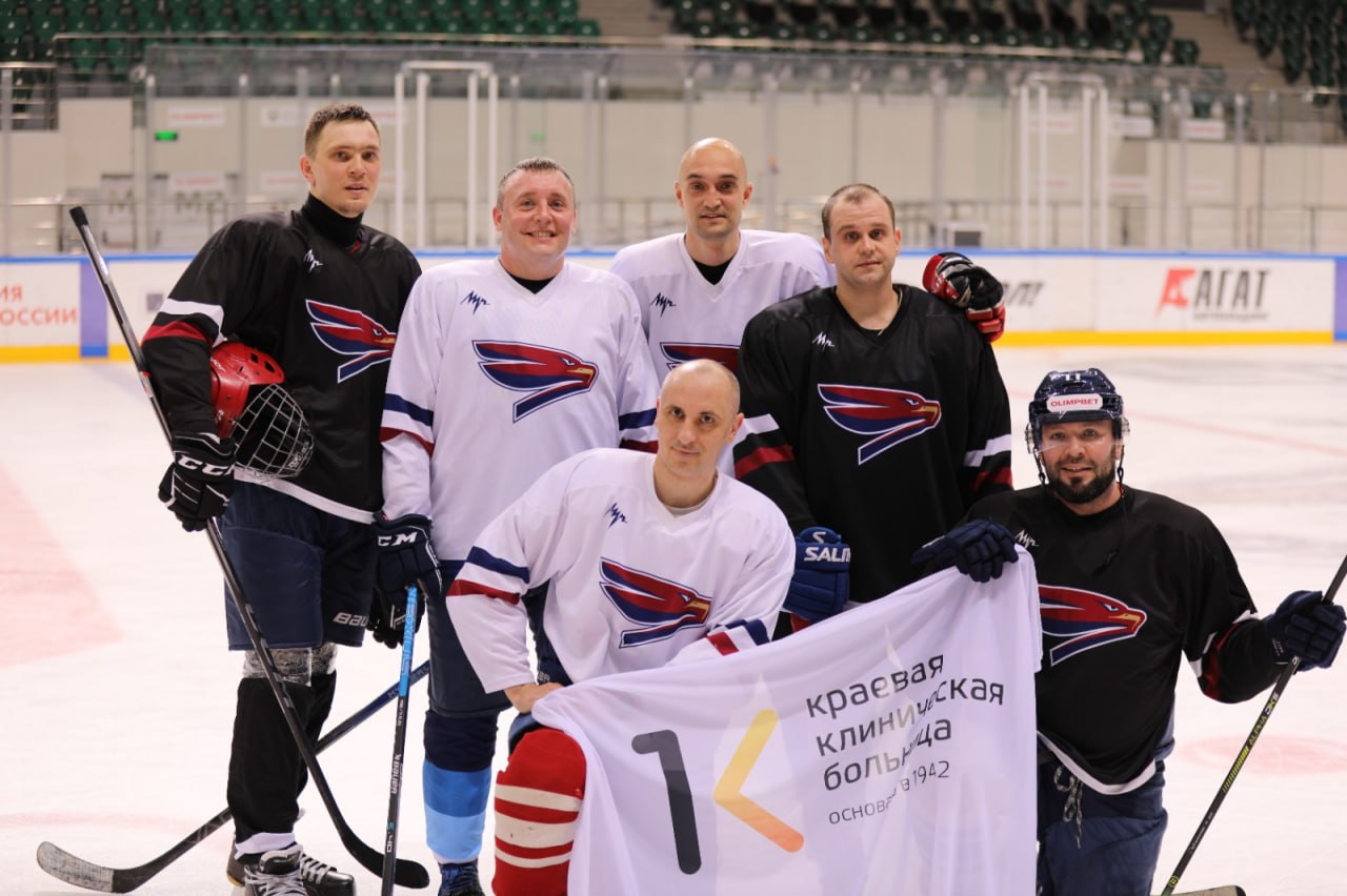 На лёд вышли медики Краевой клинической больницы. Тренировку провели в игровой форме, и, хотя счёт не вели, врачи были рады, что им удалось забить несколько шайб в ворота профессиональных спортсменов.