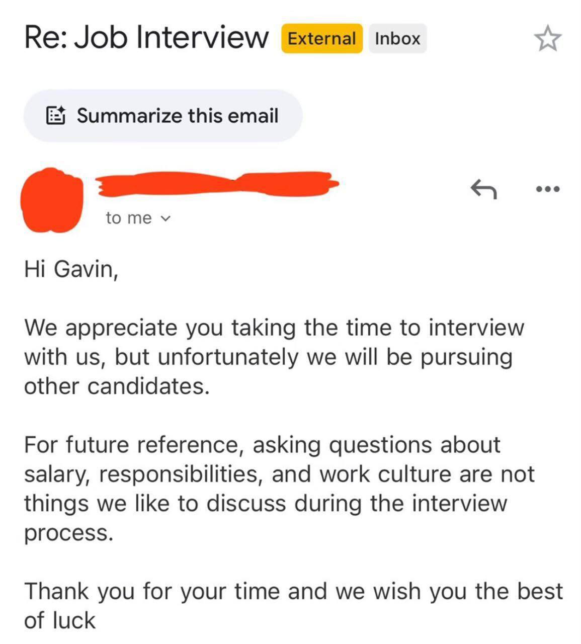«Запомните на будущее: обсуждать зарплату, обязанности и корпоративную культуру на собеседовании — моветон. Нашей компании такие разговоры не по душе».