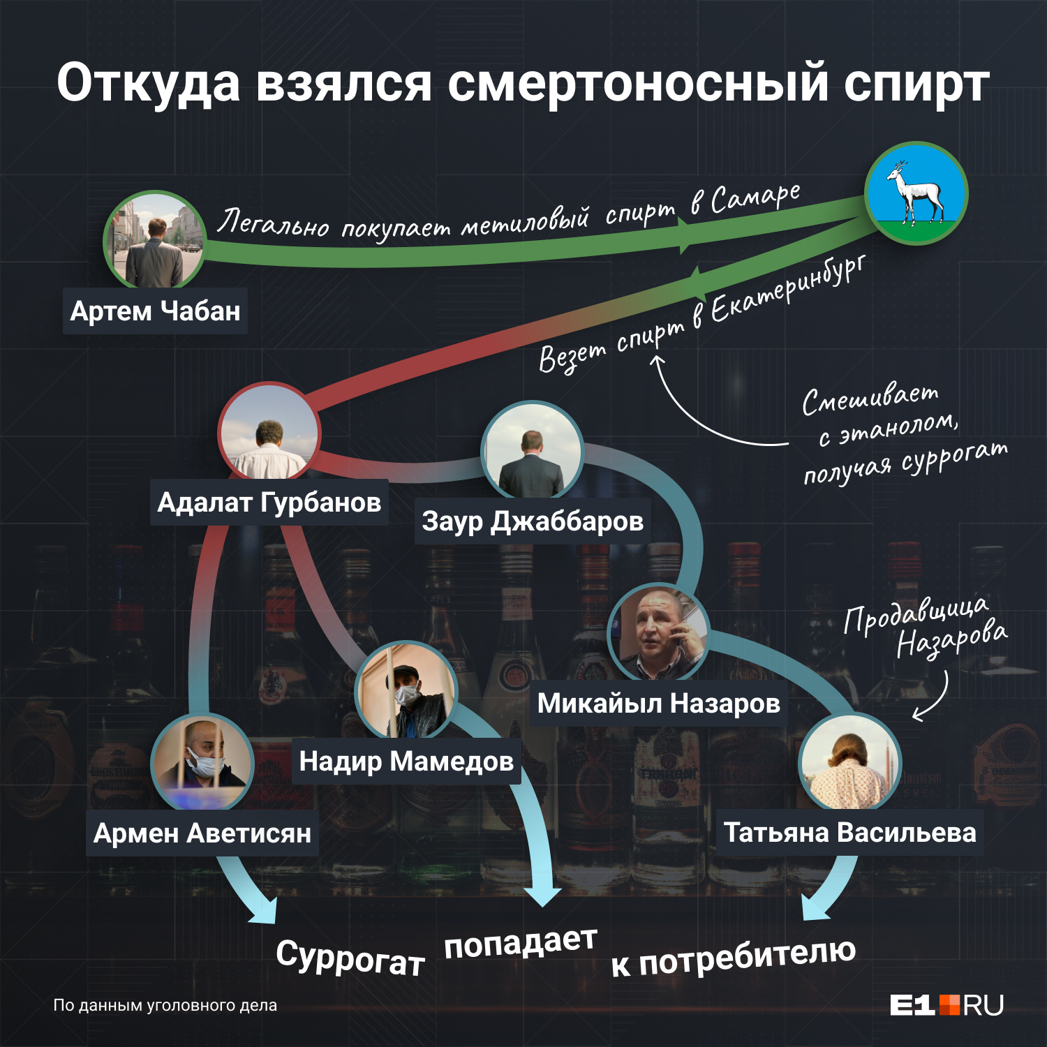 Ранее мы подробно рассказывали о роли каждого из осужденных. Торговцы спиртом везли метанол из Самары, потом в Екатеринбурге на Мурзинской, 1 разбавляли его этанолом для увеличения количества и затем продавали оптом и в розницу.