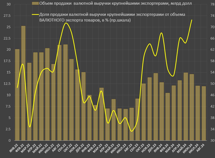 За 1П24 (последние отчетные данные по валютной структуре) продажи валюты составили 63.2% от всего объема валютного экспорта товаров всех компаний, а не только крупнейших экспортеров vs 41.1% за 1П23 и 49.5% за 1П22.