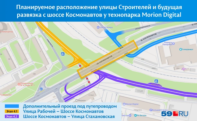 В этапе 4.1 также реконструируют путепровод по шоссе Космонавтов над Транссибирской железной дорогой — его расширят с 4 полос движения до 6. Сама улица Строителей пройдёт под шоссе.