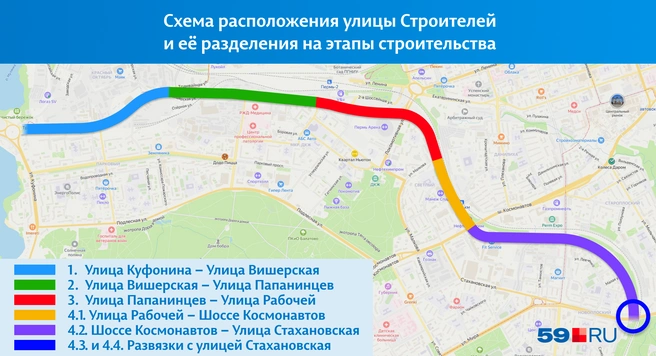 Стройка улицы Строителей разделена на 4 этапа. Работы по третьему должны завершить до конца 2025 года, однако уже сейчас движение по нему открыто, за исключением одного съезда. Следующий, четвёртый этап строительства дорожники разделили на несколько подэтапов: